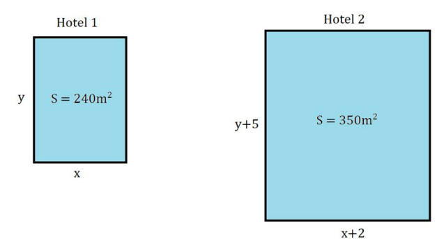Jako bazę zmiennych obieramy wymiary basenu dla hotelu 1 i odpowiednio według opisu dostosowujemy te wymiary do hotelu 2. Liczymy powierzchnie obu basenów jako iloczyn długości ich boków i z jednego równania uzależniamy y od x i wstawiamy to uzależnienie do drugiego równania, otrzymując równanie kwadratowe, na które działa klasyczny schemat rozwiązania: