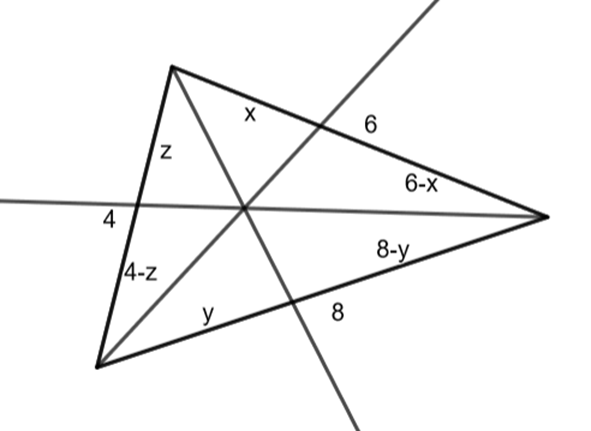 Wyznacz długości odcinków, na jakie dwusieczne kątów trójkąta o bokach 4 cm, 6 cm i 8 cm dzielą przeciwległe boki.