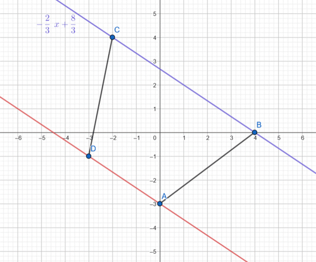 Znajdź równanie prostej zawierającej drugą podstawę trapezu, jeśli jedna z podstaw trapezu o wierzchołkach A(0,-3), B(4,0), C(-2,4), D(-3,-1) jest zawarta w prostej