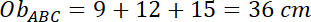 Wyznacz długość wysokości opuszczonej na przeciwprostokątną w każdym z tych trójkątów oraz sumę ich obwodów, jeśli dany jest trójkąt prostokątny ABC o bokach długości 9 cm, 12 cm i 15 cm, a trójkąt A’B’C’ jest podobny do trójkąta ABC w skali