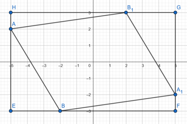 Skorzystaj z tego, że po odbiciu punktu względem początku układu współrzędnych każda z jego współrzędnych zmieni znak na przeciwny. Następnie zaznacz uzyskane punkty w układzie współrzędnych. Zauważ, że pole otrzymanego czworokąta można obliczyć odejmując od pola prostokąta EFGH pola czterech trójkątów AHB1, A1B1G, BFA1, ABE.