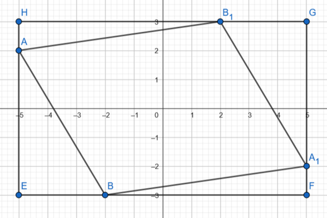 Skorzystaj z tego, że po odbiciu punktu względem początku układu współrzędnych każda z jego współrzędnych zmieni znak na przeciwny. Następnie zaznacz uzyskane punkty w układzie współrzędnych. Zauważ, że pole otrzymanego czworokąta można obliczyć odejmując od pola prostokąta EFGH pola czterech trójkątów AHB1, A1B1G, BFA1, ABE.