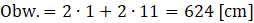 Najpierw należy wyliczyć obwód podanego prostokąta, pamiętając o tym aby zamienić decymetry na centymetry:
