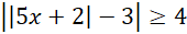 Nierówność po prawej stronie jest sprzeczna, ponieważ wartość bezwzględna nie może być mniejsza lub równa liczbie ujemnej. Jako że rozpatrujemy sumę zbiorów rozwiązań obu tych nierówności to znaczy, że zbiór rozwiązań nierówności po lewej stronie będzie jednocześnie rozwiązaniem całej podanej nierówności. Rozbijmy więc ją na kolejne przypadki:
