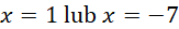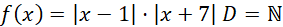 Liczba -7 nie jest naturalna, czyli nie należy do dziedziny, zatem miejscem zerowym podanej funkcji jest tylko liczba 1.