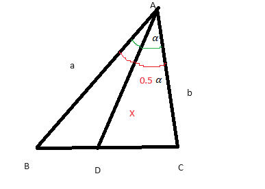 W trójkącie dwa boki mają długość a i b, a kąt zawarty między nimi jest równy a. Niech x oznacza długość odcinka dwusiecznej tego kąta, zawartego w tym trójkącie. W tym zadaniu musisz wykazać, że: jeśli α = 120°, to