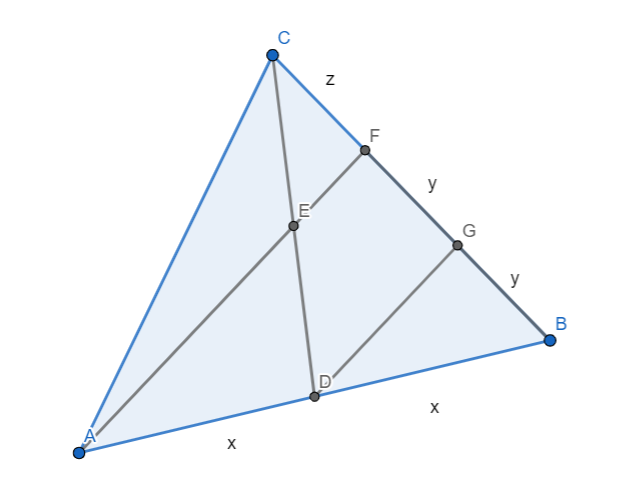 W trójkącie ABC, gdzie CD jest środkową, wierzchołek A został połączony odcinkiem z środkiem E środkowej CD, a ten odcinek został przedłużony aż do przecięcia boku CB w punkcie F. Zadaniem jest obliczenie wartości