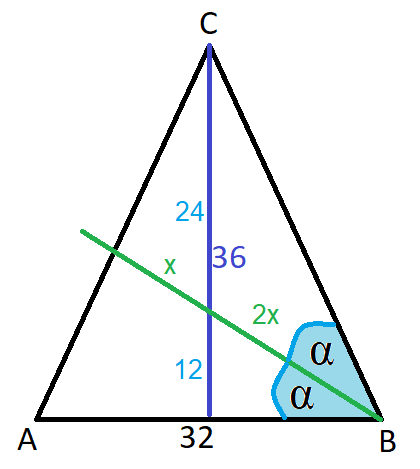 Wyznacz długość środkowej poprowadzonej z wierzchołka B trójkąta równoramiennego ABC, gdzie AC i BC to ramiona, a wysokość z wierzchołka C ma długość 36, natomiast bok AB ma długość 32.