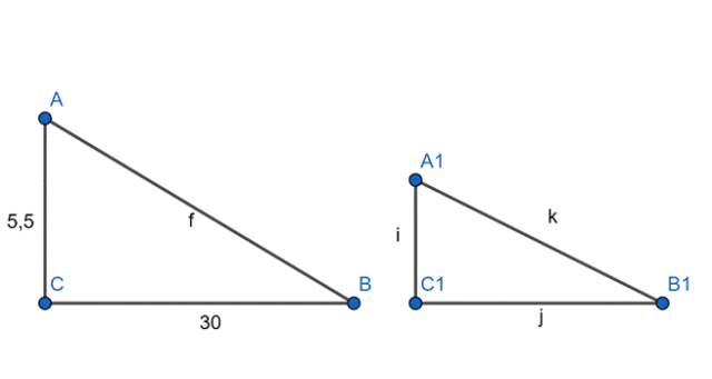 są do siebie podobne. Oblicz długość f z twierdzenia Pitagorasa. Oblicz skalę podobieństwa licząc stosunek długości boków k i f. Znając skalę podobieństwa oblicz długości boków j i i.
