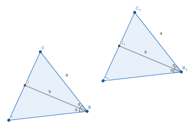 Wykaż, że jeżeli boki trójkąta ABC są równe odpowiednim bokom trójkąta A₁B₁C₁, kąty B i B₁ są równe, oraz odcinki BD i B₁D₁ są równe, to trójkąt ABC jest równoważny trójkątowi A₁B₁C₁.