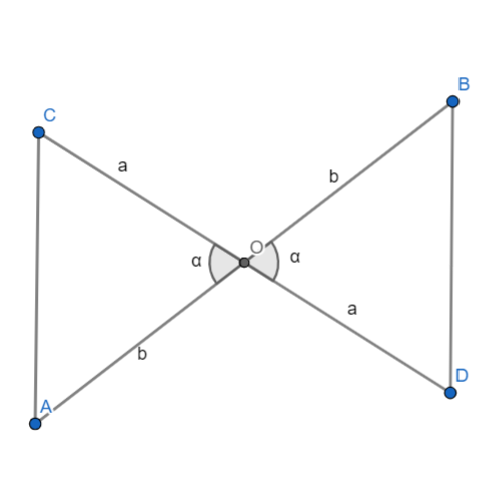 Wykaż, że jeżeli punkt O jest środkiem odcinków AB i CD, gdzie odcinki te leżą na dwóch przecinających się prostych, to proste AC i BC są równoległe.
