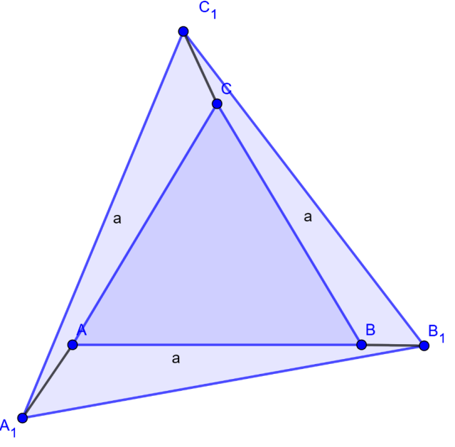 Udowodnij, że jeżeli w trójkącie równobocznym o boku a przedłużono odpowiednie boki o odcinki o długości 1, to trójkąt powstały z tych przedłużeń, oznaczony jako