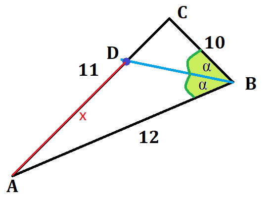 Oblicz długość odcinka AD, jeśli jest on wynikiem przecięcia boku AC trójkąta ABC przez dwusieczną kąta ABC, a długości pozostałych to: |𝐴𝐵| = 12, |𝐵𝐶| = 10, |𝐶𝐴| = 11.