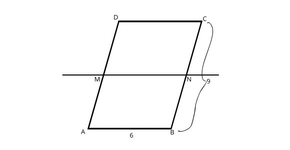 Dany jest równoległobok ABCD. Długości boków |AB| i |BC| to 6 cm i 9 cm. Na boku |AD| narysowano punkt M, przez który poprowadzono prostą równoległą do boku |AB| i przecinającą bok CB w punkcie N. Równoległobok ABNM jest podobny do równoległoboku ABCD. Oblicz odległość punktu M od punktu A.