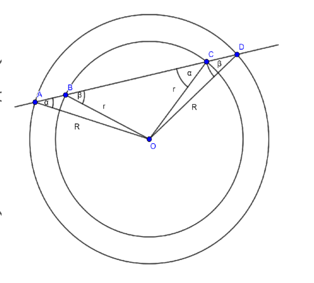 Wykaż, że jeżeli prosta przecina dwa współśrodkowe okręgi odpowiednio w punktach A, D i B, C, to |AB|=|CD|.