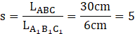 Boki trójkąta ABC mają długości |AB| = 8 cm, |BC| = 10 cm i |AC| = 12 cm. Trójkąt A₁B₁C₁ jest podobny do trójkąta ABC, a jego obwód wynosi 6 cm. Wyznacz skalę podobieństwa tych trójkątów.