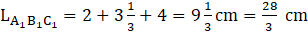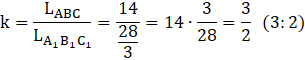 Obwód trójkąta ABC, który jest podobny do trójkąta A₁B₁C₁, wynosi 14 cm. Dodatkowo, wiemy, że długość boku A₁B₁ wynosi 2 cm, boku B₁C₁ wynosi 3 1/3 cm, a boku A₁C₁ wynosi 4 cm. Wyznacz wartość skali tych trójkątów.