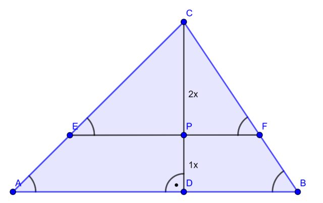 Obwód trójkąta ABC wynosi 21 cm. Prosta równoległa do podstawy AB przecina wysokość CD w punkcie P, a boki AC i BC w punktach E i F. Znając stosunek długości odcinków |DP| do |PC|, który wynosi 1:2, oblicz obwód trójkąta CEF.