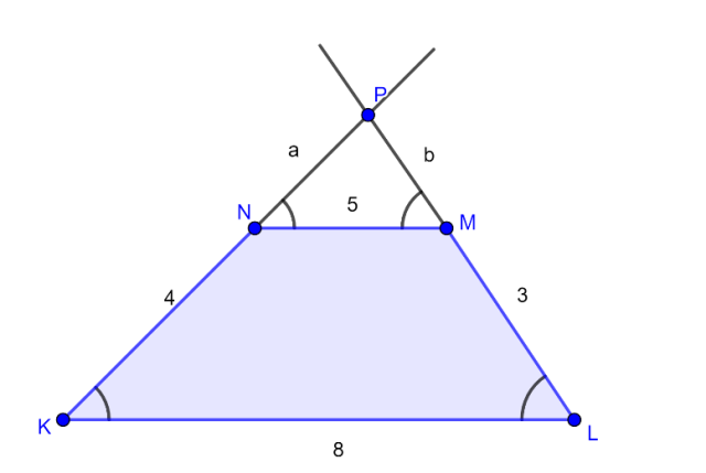 W trapezie, gdzie długości podstaw wynoszą 5 cm i 8 cm, a długości ramion wynoszą 3 cm i 4 cm, przedłużono ramiona trapezu do przecięcia w punkcie P. Oblicz obwód trójkąta, którego jeden z wierzchołków jest punktem P, a dwa pozostałe wierzchołki są końcami dłuższej podstawy trapezu.