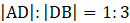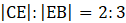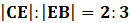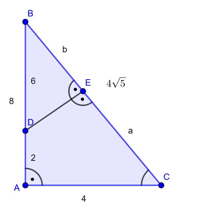 W trójkącie prostokątnym ABC, gdzie przyprostokątne mają długość |AB|=8 cm i |AC|=4 cm, punkt D dzieli bok AB w stosunku |AD|:|DB|=1:3. Punkt E należy do boku BC, a odcinek DE jest prostopadły do boku BC. Oblicz stosunek |CE|:|EB|.