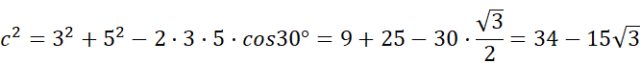 Twierdzenie cosinusów: w dowolnym trójkącie kwadrat długości jednego boku jest równy sumie kwadratów długości dwóch pozostałych boków, zmniejszonej o podwojony iloczyn długości tych boków i cosinusa kąta zawartego między nimi.