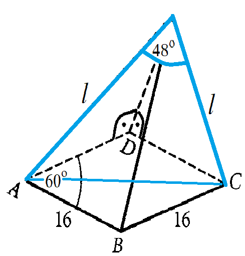 Masz podany ostrosłup, w którego podstawie jest romb o boku 16 i kącie ostrym 60º. Jedna z jego krawędzi bocznych przechodzi przez wierzchołek rozwartego kąta rombu i jest prostopadła do płaszczyzny podstawy, natomiast boczne krawędzie tego ostrosłupa, które przechodzą przez wierzchołki kątów ostrych, tworzą kąt 48º. Twoim zadaniem jest wyznaczenie objętości tego ostrosłupa. Wynik zaokrąglij do całości.