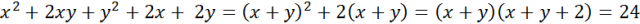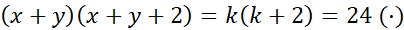Szukane liczby x i y muszą być naturalne oraz dodatnie, więc również ich suma k jest naturalna i dodatnia. Iloczyn sumy k oraz sumy powiększonej o dwa k+2 wynosi 24, więc obie te liczby muszą być dzielnikami liczby 24.