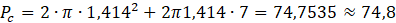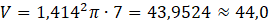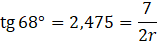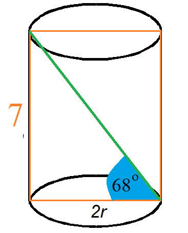 Oblicz objętość i pole powierzchni całkowitej walca, którego wysokość wynosi 7, a przekątna przekroju osiowego jest nachylona do płaszczyzny pod kątem 68º. Wyniki podaj, zaokrąglając je do pierwszego miejsca po przecinku.
