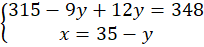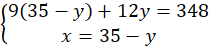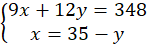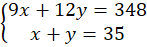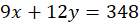 Przyjmij za x ilość przejechanych kilometrów po mieście, a za y ilość przejechanych kilometrów autostradą. Zauważ, że kierowca zrobił w sumie 348 kilometrów, a 9x to ilość kilometrów przejechana w mieście, zużywając x litrów paliwa, a 12y to ilość kilometrów przejechana autostradą, zużywając y litrów paliwa, zapisz równanie: