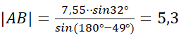 W trójkącie ABC kąty są odpowiednio równe α, β, 𝛾. W tym zadaniu musisz obliczyć długość boku AB, jeśli α = 17°, 𝛾 = 32°, |AC| = 7,55 cm.