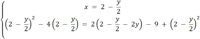Rozwiązano podany układ równań. Metoda przeciwnych współczynników polega odpowiednim przemnożeniu obu stron danego równania tak, aby po zsumowaniu obydwu równań, wyrażenia podobne się uprościły. Metoda podstawienia polega na zapisaniu jednej zmiennej w postaci wyrażenia zawierającego drugą zmienną (np. y = 2x – 2), a następnie wstawieniu tego wyrażenia do drugiego równania, w miejsce zmiennej.