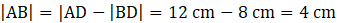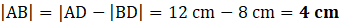 W tym zadaniu musisz obliczyć długość odcinków AB, BC, CD, leżących na jednej prostej, wiedząc, ile wynoszą długości |AD|=12cm, |AC|=6cm oraz |BD|=8cm.