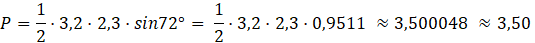 Masz wyznaczyć pole trójkąta z dokładnością do dwóch miejsc po przecinku, jeśli wiadomo, że |𝐴𝐵| = 3,2, |𝐴𝐶| = 2,3 i ∢𝐵𝐴𝐶 = 72°.