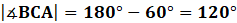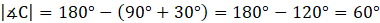 Kąt C przylegający do kąta BCA: na podstawie sumy kątów w trójkącie: