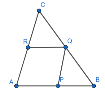Wyznacz obwód trójkąta ABC, jeśli w trójkącie ABC poprowadzono odcinek RQ równoległy do boku AB (R leży na boku AC, Q leży na boku BC) i odcinek PQ jest równoległy do boku AC (P leży na boku AB). Dane są długości: .