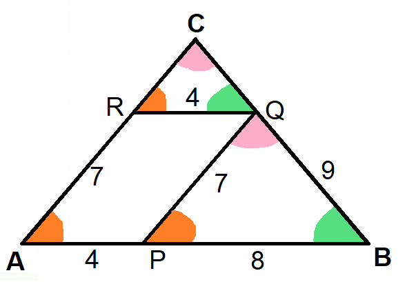 Masz wyznaczyć obwód trójkąta ABC, w którym poprowadzono dwa odcinki: jeden równoległy do boku AB tak, że R leży na boku AC, a Q na boku BC, a drugi odcinek jest równoległy do boku AC, przy czym punkt P leży na boku AB. Wiadomo również, że |𝑃𝐵| = 8, |𝑄𝐵| = 9, |𝑃𝑄| = 7, |𝑅𝑄| = 4.