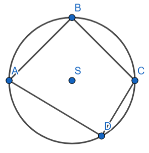 Udowodnij, że kąt ostry tego czworokąta jest równy , jeśli czworokąt ABCD jest wpisany w koło o środku S. Przekątna AC jest średnicą koła, a kąt BSD ma miarę .