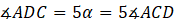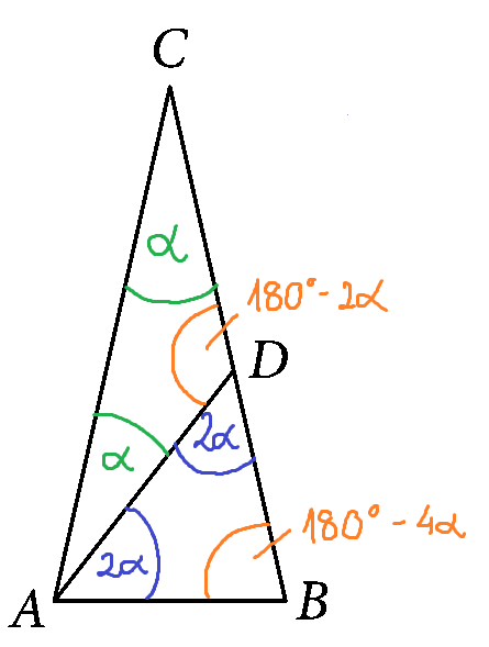 Masz udowodnić, że na przedstawionym rysunku ∢𝐴𝐷𝐶 = 5 ⋅∢𝐴𝐶𝐷, jeśli odcinek AD dzieli trójkąt równoramienny na dwa inne trójkąty równoramienne.