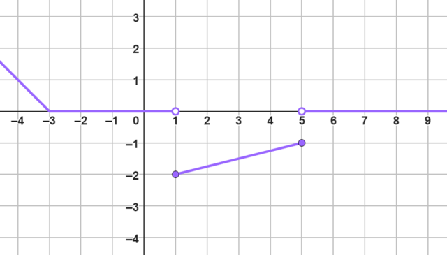 Zauważ, że na wykresie miejsca zerowe to argumenty, dla których wykres funkcji przecina oś OX. Narysuj więc wykres funkcji, który rozciąga się w nieskończoność wzdłuż osi OX i leży dokładnie na niej od argumentu -3 włącznie do argumentu 1 oraz osobno od argumentu 5 aż do dodatniej nieskończoności. Ze względu na stosowane przy zapisie podanej sumy przedziałów nawiasy otwarte musisz w odpowiednie miejsca wstawić punkty puste w środku. Aby było to możliwe bez zmieniania dziedziny funkcji, wystarczy podzielić wykres na kilka osobnych części.