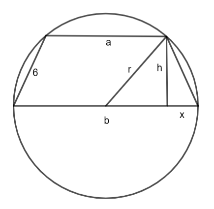Skorzystaj z funkcji sinus, aby obliczyć wysokość trapezu, a następnie z twierdzenia cosinusów wyznacz długość promienia i jego podstawy, a na koniec pole.