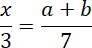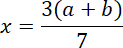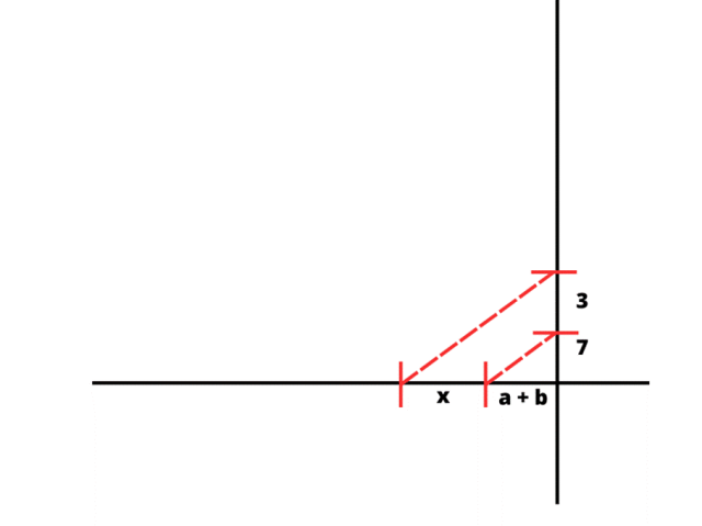 Rysujemy na osi x odcinek a + b. Na osi y rysujemy odcinek 7, a nad nim odcinek 3. Łączymy koniec odcinka a + b z końcem odcinka 7. Rysujemy równoległy odcinek zaczynający się na końcu odcinka 3 i kończący się na osi x. Na osi x powstał odcinek o długości x. Jest on szukanym odcinkiem.