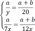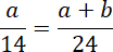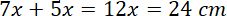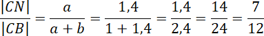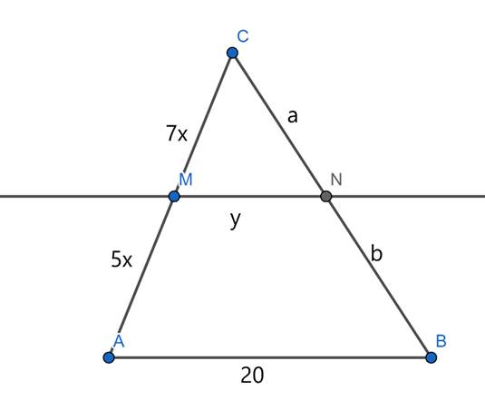 Niech odcinek CM ma długość 7x, a odcinek MA długość 5x. Odcinek MN będzie mieć długość y. Odcinek CN będzie miał długość a, a odcinek NB długość b. Oblicz wartość x, wiedząc, że |AC| = 24 cm. Następnie skorzystaj z twierdzenia Talesa