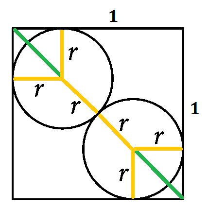 Na rysunku masz kwadrat, którego boki mają długość 1. Wpisano w niego dwa przystające okręgi styczne zewnętrznie oraz styczne do boków tego kwadratu. Udowodnij, że promień okręgu wynosi
