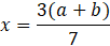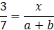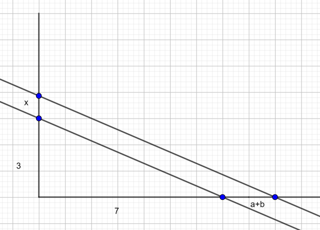 Narysuj dwie proste prostopadłe do siebie. Na jednym boku odmierz 3, na drugim odmierz 7. Następnie na tym samym boku wyznacz dowolne a+b. Połącz ze sobą wyznaczone 3 i 7 prostą. Narysuj prostą równoległą do poprzedniej prostej. Zaznacz punkt, w którym przetnie się prosta z drugim bokiem. Od tego punktu do a znajduje się x.