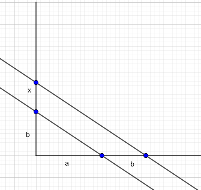 Narysuj dwie proste prostopadłe do siebie. Na jednym boku wyznacz b, a na drugim a. Następnie na tym samym boku wyznacz dowolne b. Połącz ze sobą wyznaczone a i b prostą. Narysuj prostą równoległą do poprzedniej prostej. Zaznacz punkt, w którym przetnie się prosta z drugim bokiem. Od tego punktu do a znajduje się x.