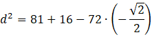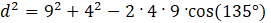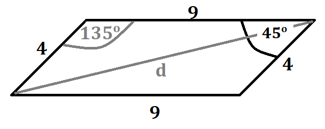 Masz wyznaczyć długość dłuższej przekątnej w równoległoboku, w którym boki mają długość 4 oraz 9, a jego kąt ostry ma miarę 45°.