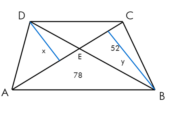 W trapezie ABCD, AB|| DC, poprowadzono przekątne, które przecięły się w punkcie E. Pola trójkątów ABE i BCE są odpowiednio równe 78 i 52. W tym zadaniu musisz obliczyć pole trójkąta CDE.