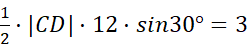 Dwa boki trójkąta ABC mają długość: |AC| = 6, |BC| = 12, a kąt ACB ma miarę 120°. Przez punkt C poprowadzono prostą prostopadłą do boku AC, która przecięła bok AB w punkcie D. W tym zadaniu musisz obliczyć długość odcinka CD.