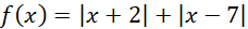 Przyrównaj podany wzór funkcji do zera i rozwiąż tak powstałe równanie. Zauważ, że suma wartości bezwzględnych może być równa 0 tylko jeśli wyrażenia wewnątrz obydwu z nich są jednocześnie równe 0. Następnie ułóż odpowiedni układ równań, rozwiąż go i stwierdź, że nie ma on rozwiązań. Na końcu zapisz, że w takim razie podana funkcja nie ma miejsc zerowych.