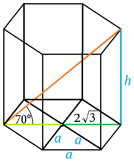 Masz wyznaczyć objętość graniastosłupa prawidłowego sześciokątnego, którego podstawa została wpisana w koło o promieniu 2√3. Jego najdłuższa przekątna tworzy z płaszczyzną podstawy kąt 70º. Wynik masz zaokrąglić do liczby całkowitej.